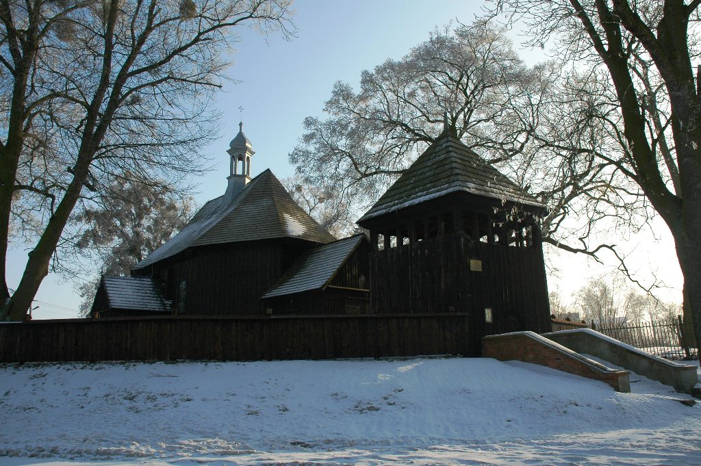 Drewniany kościół parafialny pw. św. Trójcy pobudowany w 1754 r. z funduszy dziedzica Kucharek Walentego Otto Trąmpczyńskiego i staraniem miejscowego proboszcza ks. Piotra Szkudlarskiego. W XVIII w remontowany i ozdobiony polichromiami, powiększony w XIX w o kruchtę zachodnią. Kościół orientowany, o ścianach sumikowo-łątkowych i oszalowanych, z dachem pokrytym gontem. Salowy, na planie wydłużonego ośmioboku, z niewyodrębnionym prezbiterium, z dwiema kruchtami przylegającymi do części nawowej i pd – wsch. zakrystią. Ołtarz główny, ambona z XVII w., manierystyczny obraz Anioła Stróża z XVII w. oraz wczesnobarokowy krucyfiks i dwie rzeźby na belce tęczowej z XVII w pochodzą ze starszego kościoła. Dwa barokowe ołtarze boczne z XVIII w. Dzwonnica drewniana z 1783 r. nakryta dachem namiotowym, z przelotową dawniej bramą, a drewniane ogrodzenie tzw. cmentarza przykościelnego zrekonstruowane w 1949 r.